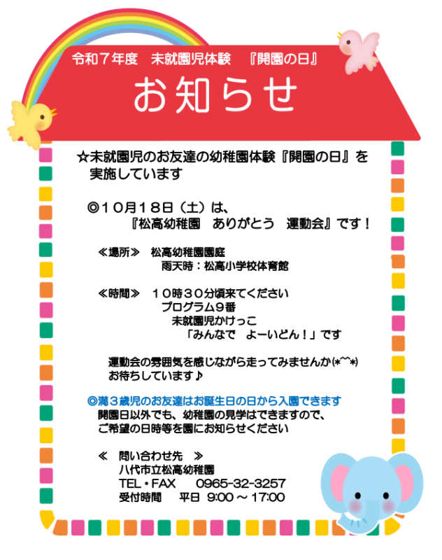 2学期の未就園児体験の日をお知らせいたします