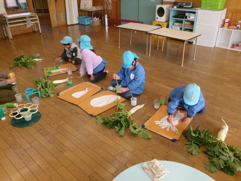 年長組は、自分が育てて収穫した大根の絵を描きました「この大根。踊っている足みたい