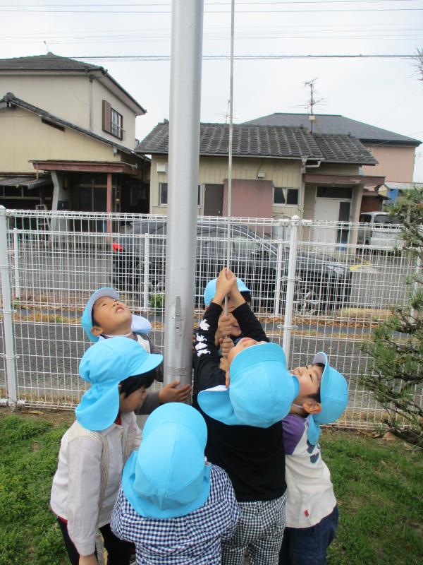 幼稚園では、この時期にこいのぼりを出します。年長児が「手伝うよ~。」と集まりました。