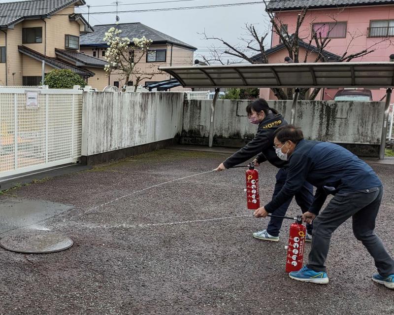 子供たちがDVDを視聴している時間に、職員は水消火器を使って消火訓練を行いました。