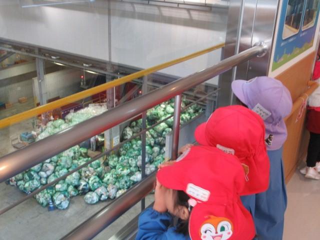いよいよ施設の見学です。エコエイトには、次から次に清掃車がやって来ます。この日は火曜日、園児が住んでいる麦島や植柳地区から運ばれてきました。たくさんのゴミに子供たちも私たち職員も驚きました!