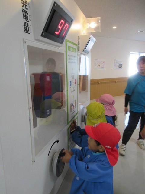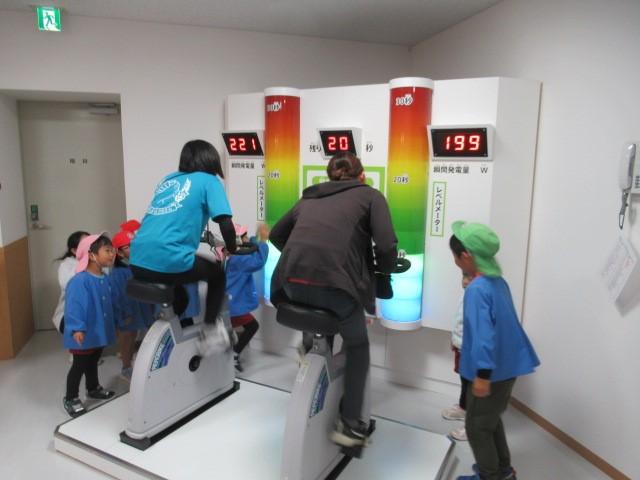 子供たちも体験!電気を作ってみよう♪ 子供たちが、ハンドルをぐるぐる回すと発電して、ライトが点灯しました。先生たちもペダルを懸命に踏み続け、電気を貯めましたよ。