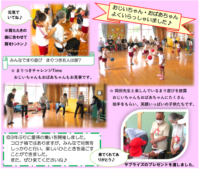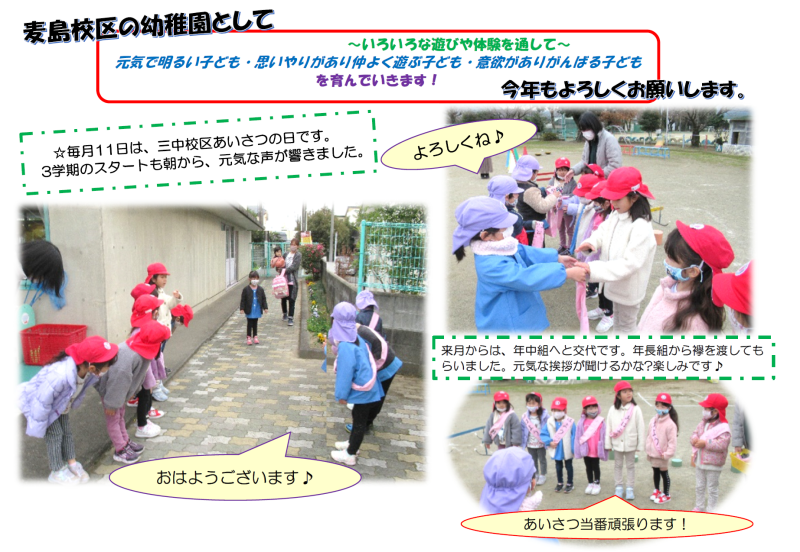☆麦島幼稚園、やすらぎ保育園、キューピー保育園、白梅保育園、麦島小学校(年長児と1年生)の交流活動です。 幼稚園の子供たちは、保育園のお友達と出会えたこと、一緒に活動して仲良くなったことで入学式で会えることを楽しみにしています。また、小学校1年生の小学校生活の紹介は、年長児にとってとても分かりやすく、小学校のことをたくさん知ることができたことを喜んでしました。