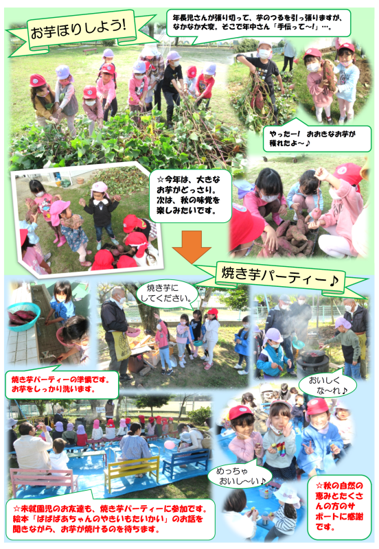 ☆幼稚園の畑で大きいお芋がたくさん穫れましたので、毎年恒例の焼き芋パーティーを開催しました。今年度は、3年ぶりに未就園児さんも招待しました。6組の参加があり、みんなで秋の味覚を堪能しました。