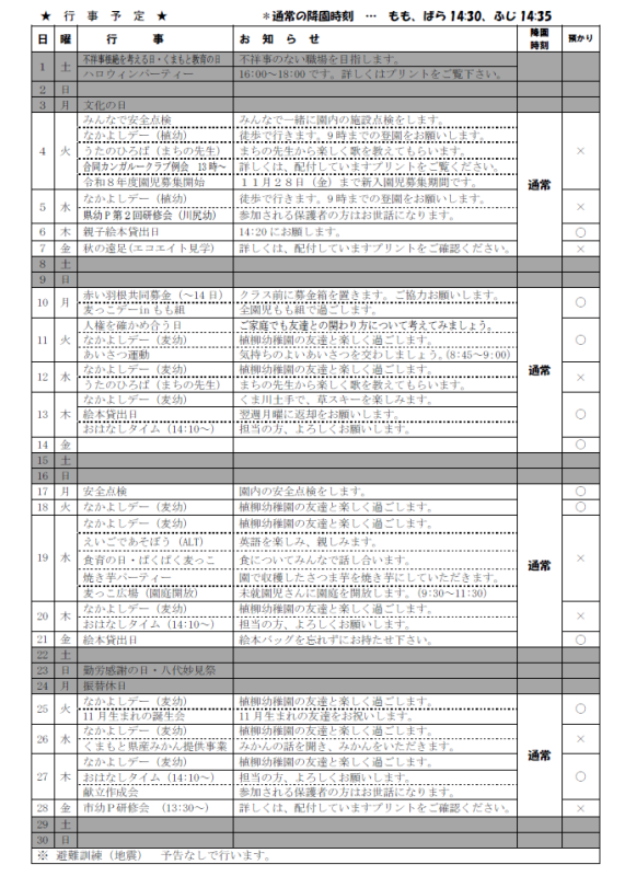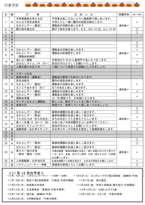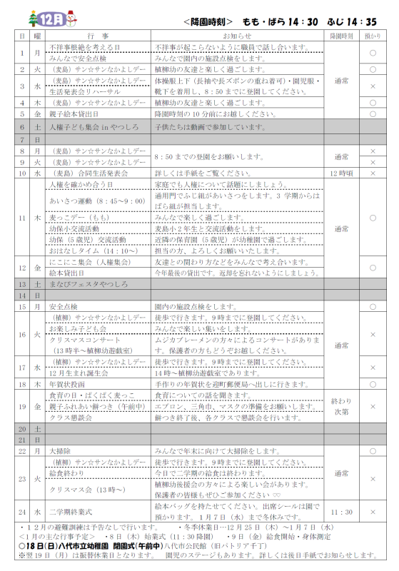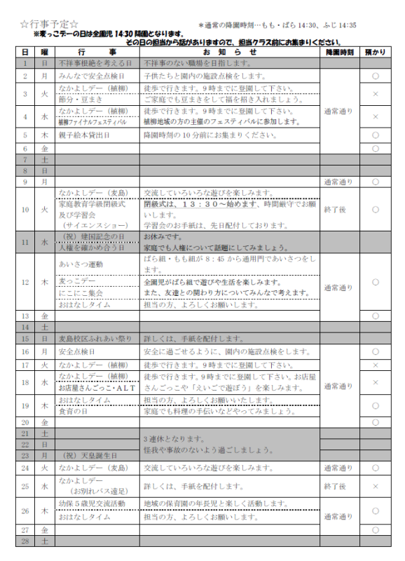 《 麦島幼稚園の行事予定です。都合により行事を変更する場合もあります。》