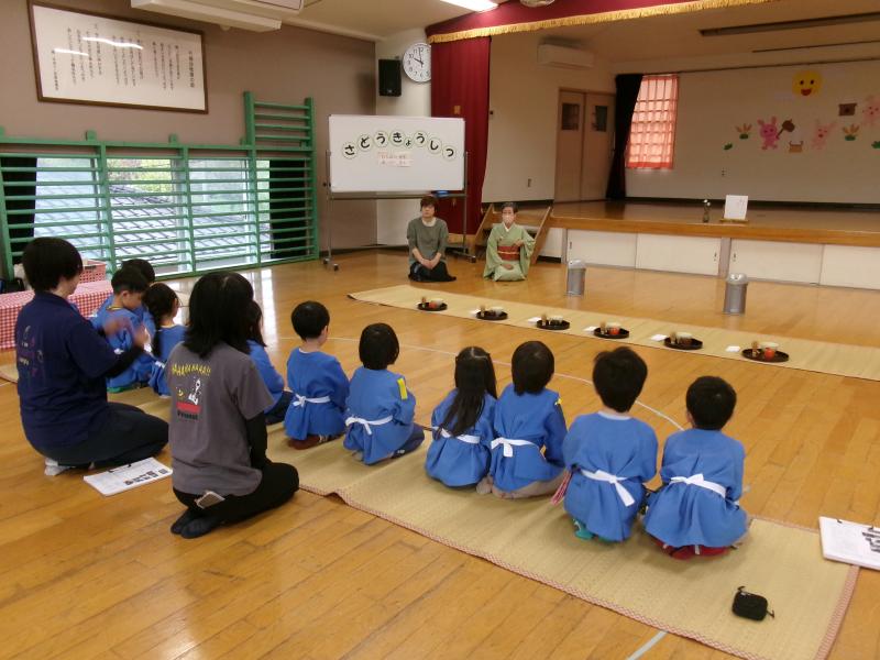 茶道の村岡先生と阿部先生をお招きして今年初めの茶道教室を全園児で体験しました。