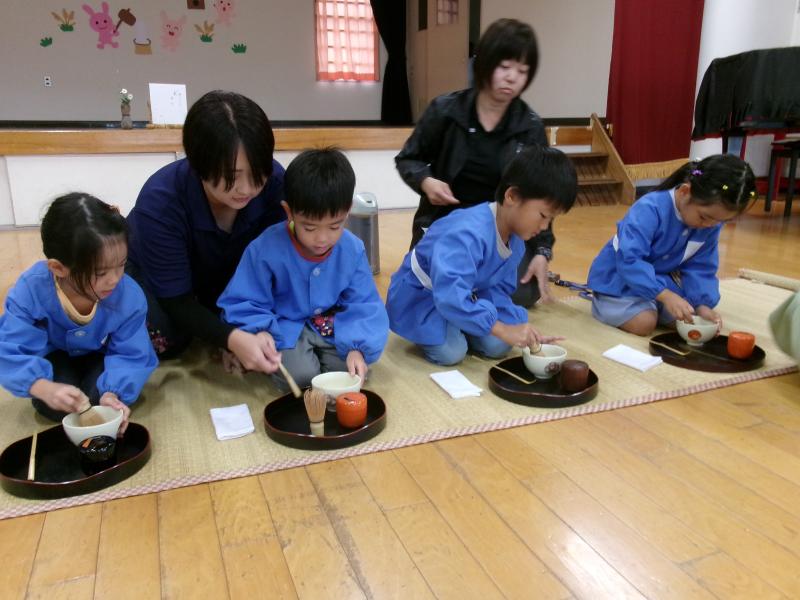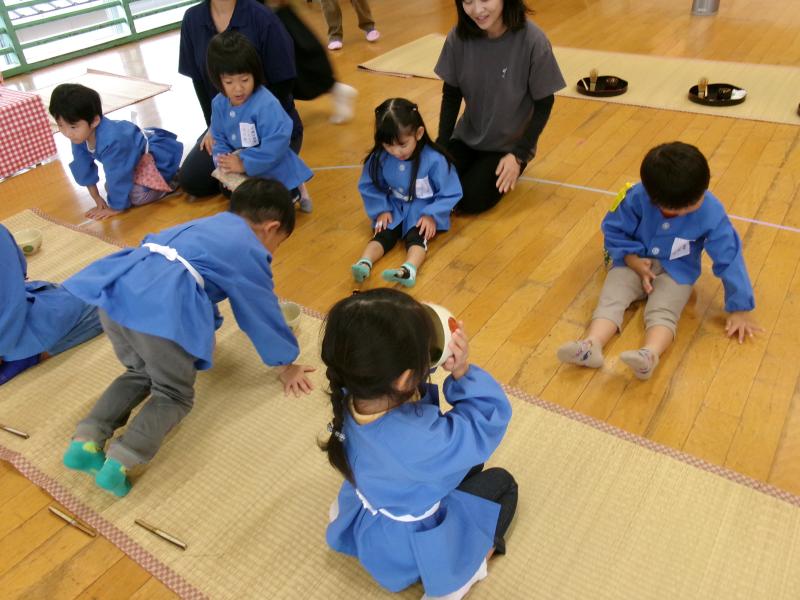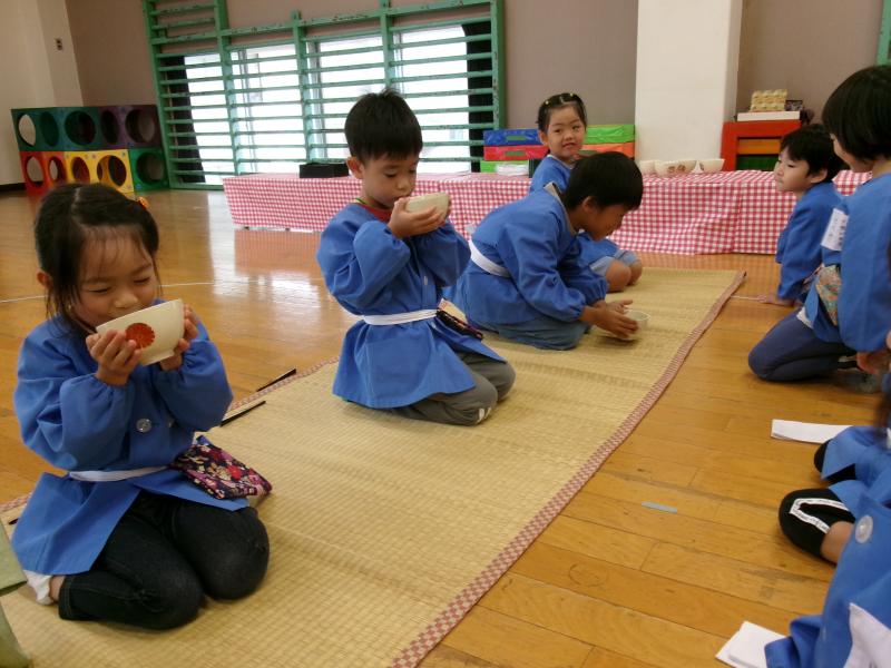 「お菓子をどうぞ」「いただきます」と手を添え、正座をし、お茶を差し出すときの礼儀作法など、普段の遊びとは違う静けさと緊張感が漂いました。お茶を点てる手つきは、どこか誇らしげで、子供達の目は真剣です