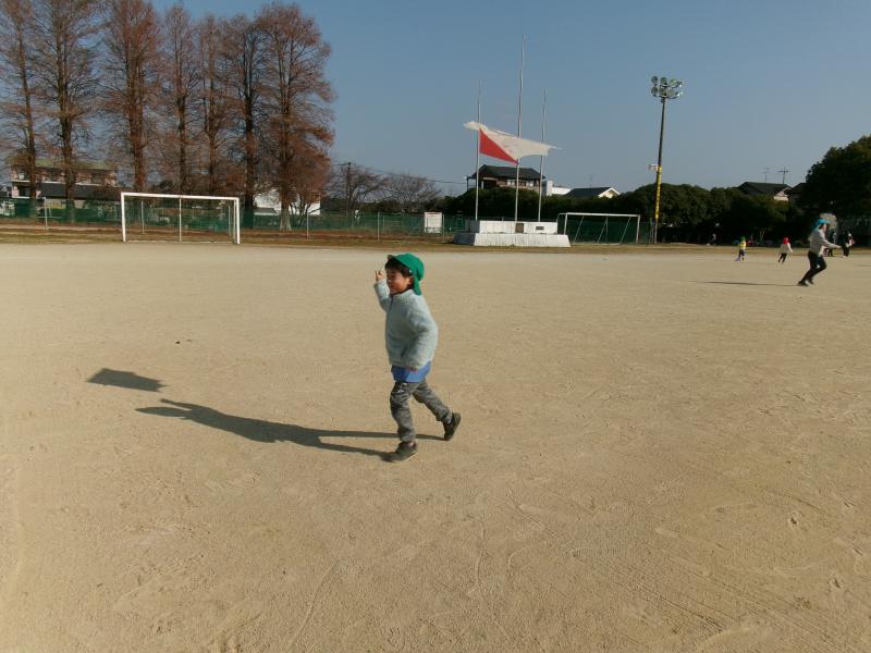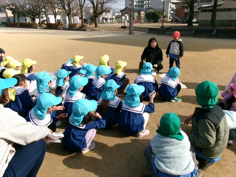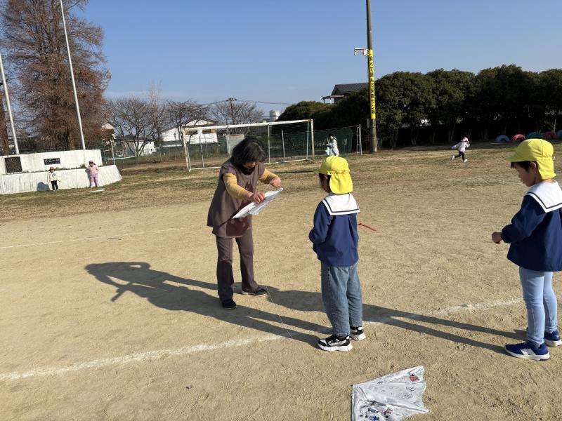 風に乗って凧が高く上がると歓声があがり、3歳児は疲れると土の上でお絵描きを始める姿もあり、冬の戸外遊びをのびのびと楽しむ時間となりました。最後に思いを伝えあうと、「話したい!」と次々に前に出て、凧が上がったことや楽しかった気持ちを嬉しそうに話しました。