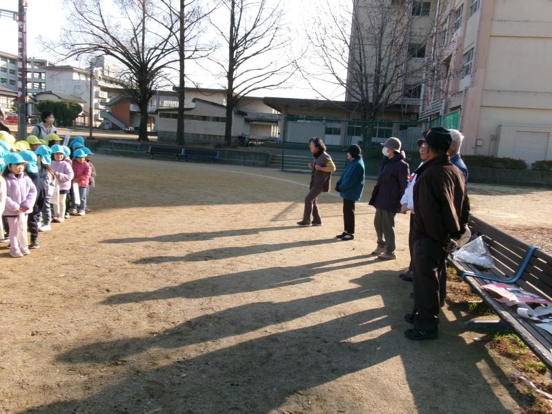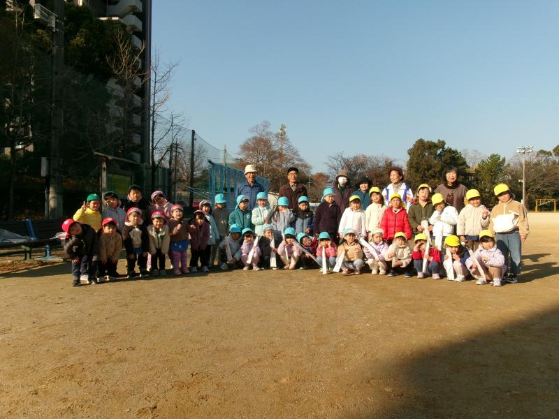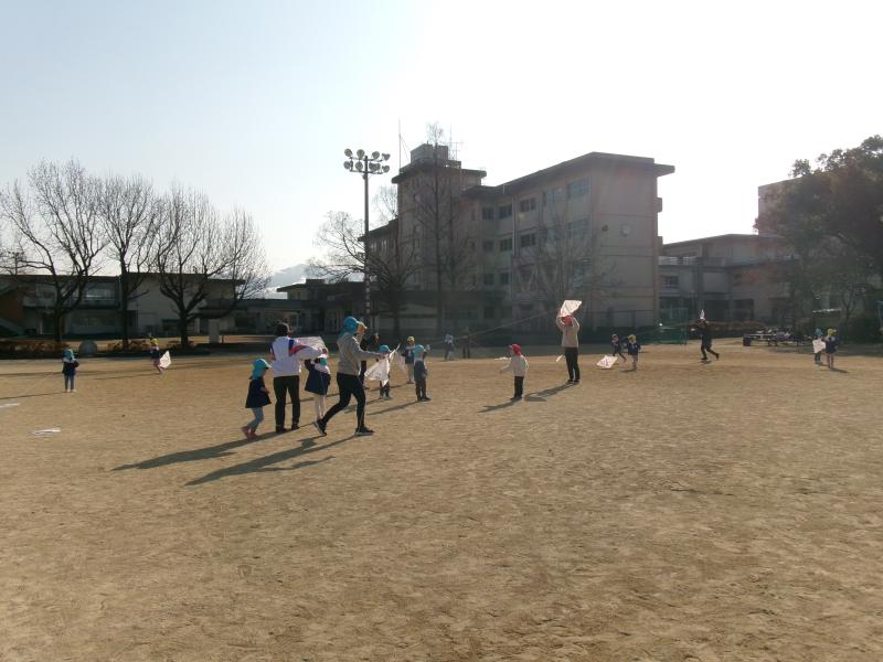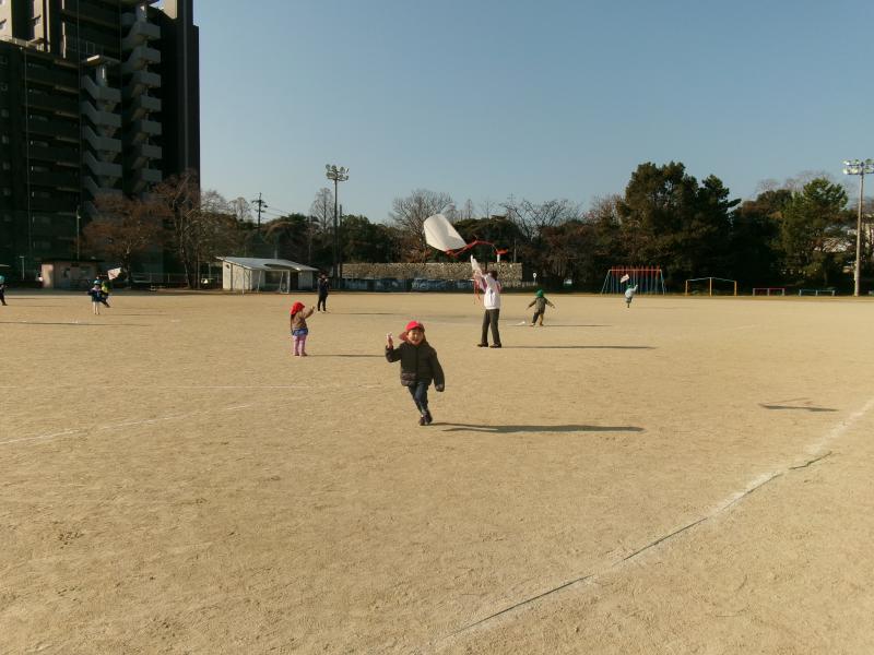 地域の友愛会の方々や保育園児さんと一緒に、代陽小学校の校庭で凧揚げを楽しみました。3・4・5歳児はそれぞれ作った凧を手に元気に走り、友愛会の方に凧を持ってもらったり、絡まった糸をほどいてもらったりしながら、温かな交流が見られました。