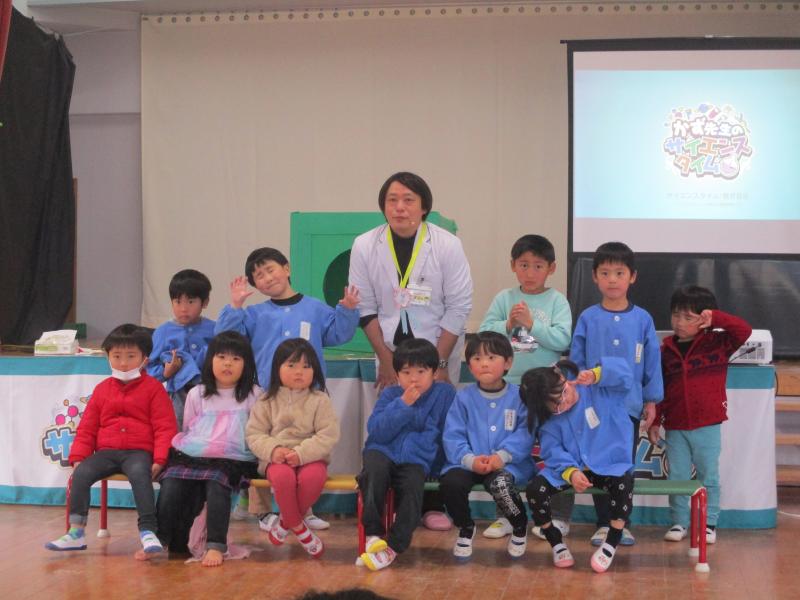 麦島幼稚園での交流日、スペシャルゲストかず先生をお招きしてのサイエンスショーに参加しましたサイエンスショーと聞いて子供たちは ”何だろう