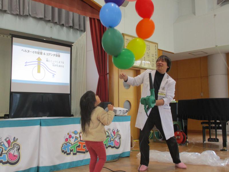 ” ”よく分からないけど何か楽しそう”と、興味関心をもちながら話を聞き、割れない大きなシャボン玉や、風の力を使って宙に浮き続けるものは何か、日本最大級の空気砲等