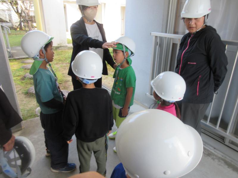 緊急地震速報の音が鳴り、急いで体を丸め、ダンゴムシのポーズをする子供たち。今日は、みんなでシェイクアウト訓練をしました地震だけでなく、津波が来ていることを放送で知り、先生の指示に従って園庭に出ます。その後、ヘルメットをかぶり、市営住宅へ避難しました