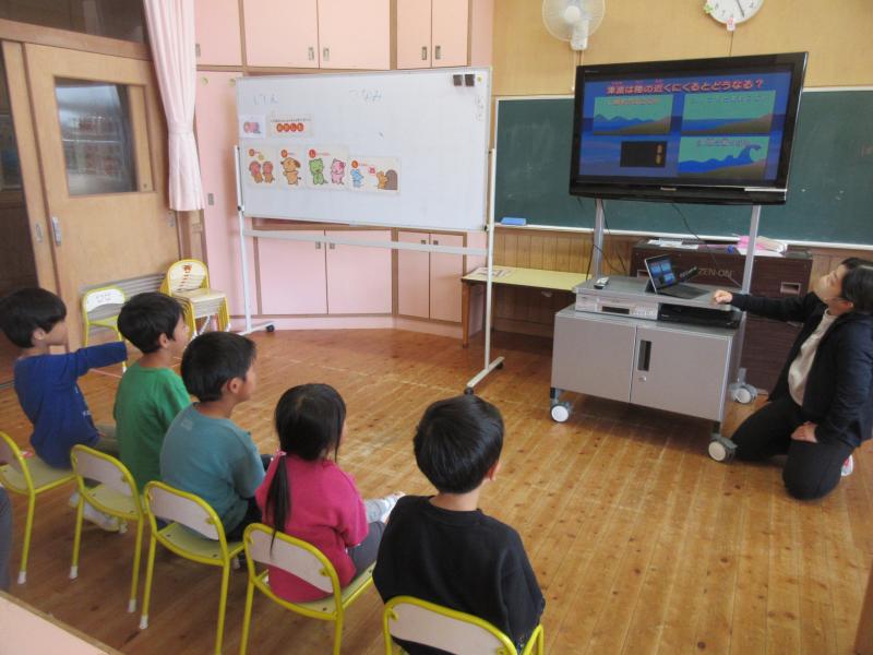 部屋に戻ってからは、動画や話を通して、ヘルメットが頭を守ってくれることや津波は何度も押し寄せ、陸に近づくと波が高くなることを学びました