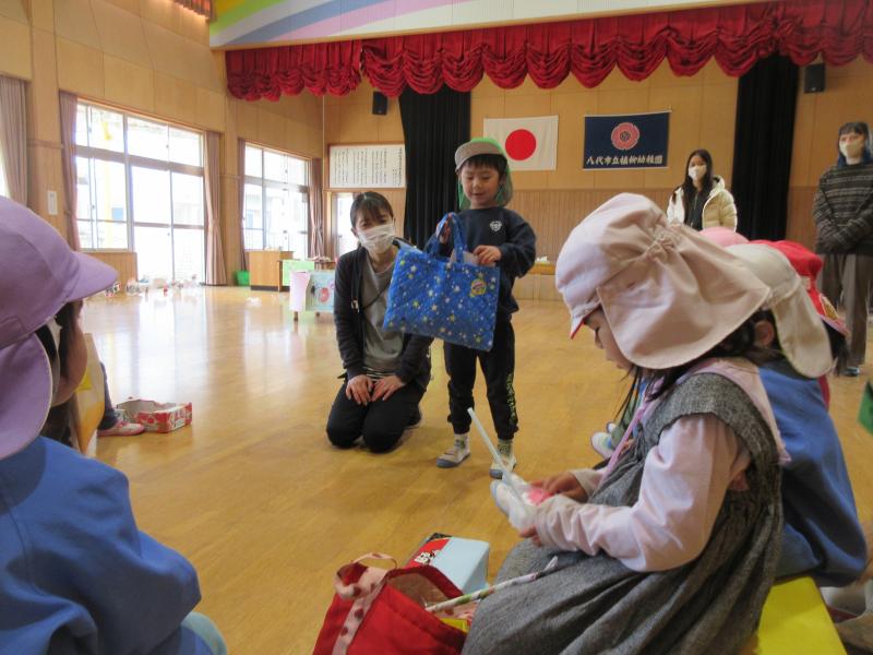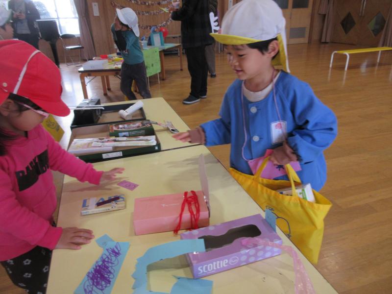 先日、地域や後援会の方々のご協力により開催された「植柳幼稚園ファイナルフェスティバル」では、子供たちが心から楽しむ様子や満ち足りた笑顔が見られました興奮・ヤッター!振り返りでは、「わたあめ美味しかった!」「ショベルカーが楽しかった星」と思い思いに感想を伝えあう子供たち。今度は、その楽しかったお店やお祭りを自分たちの力で実施しようと、年長児を中心に、麦島幼稚園の友達と祭りの計画を立てていきましたピース話し合いを通して祭りの名前やチーム、約束を決め、自分たちで作った品物を並べ、迎えた当日…。食べ物、おもちゃ、体験、ペットなどのコーナーがある、立派な「こどもうやなぎむぎしまふぁいなるまつり」が開催されました!友達のつくった品物に興味をもち、「これは何ですか?」と尋ねる子供、自分で作った品物について誇らしく説明する子供、買ったものを友達に見せて笑い合う子供、それぞれがいっぱい楽しんでいましたハート年長児によるくじ引きのサプライズもあり、「またしたい!」と思い出に残るお祭りごっことなりました星